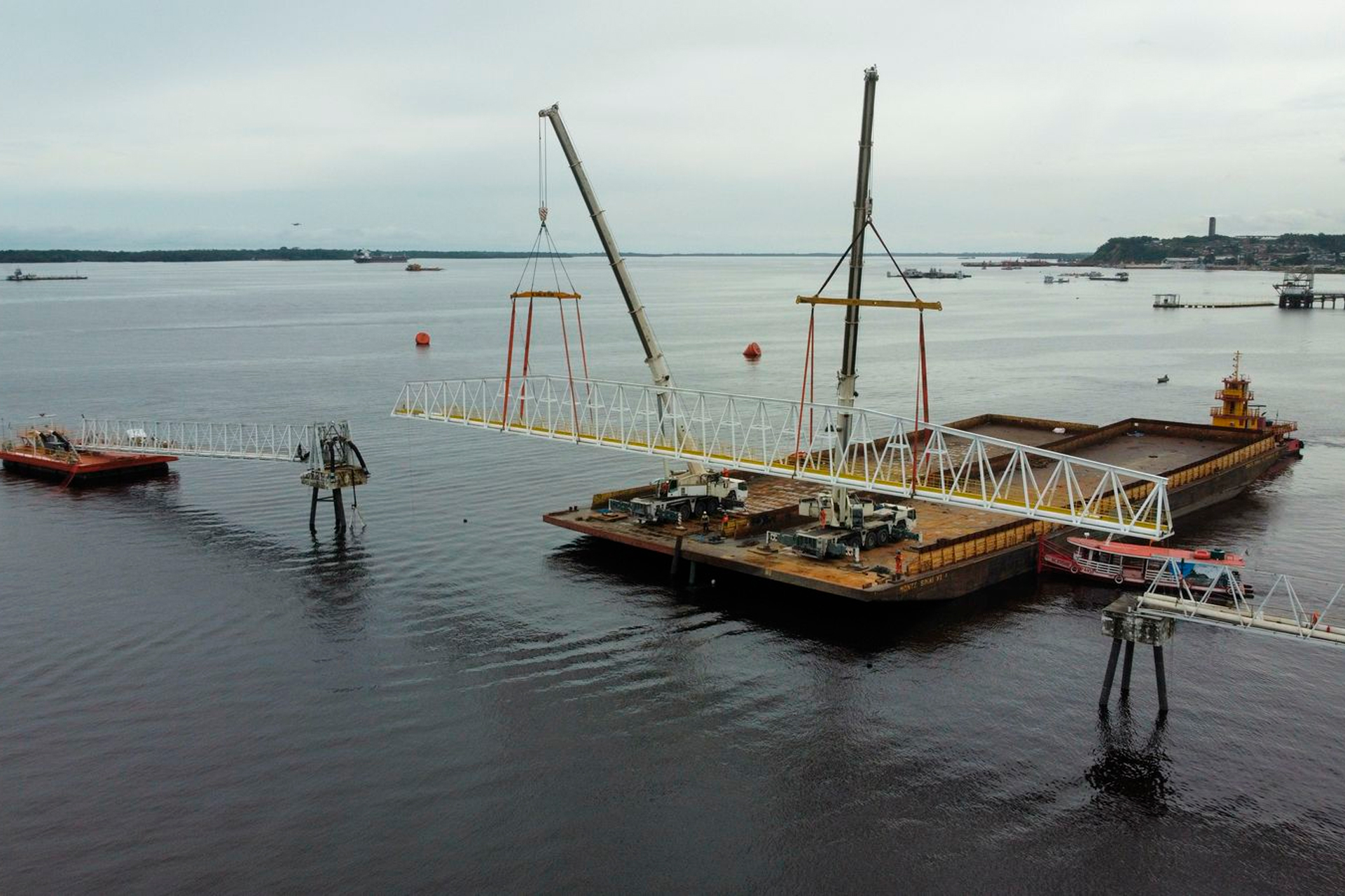 Fabricação e instalação de treliça portuária para vão livre de 74m, pesando 44